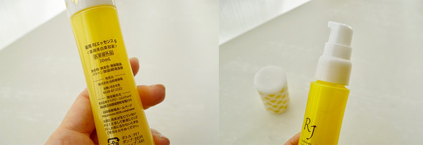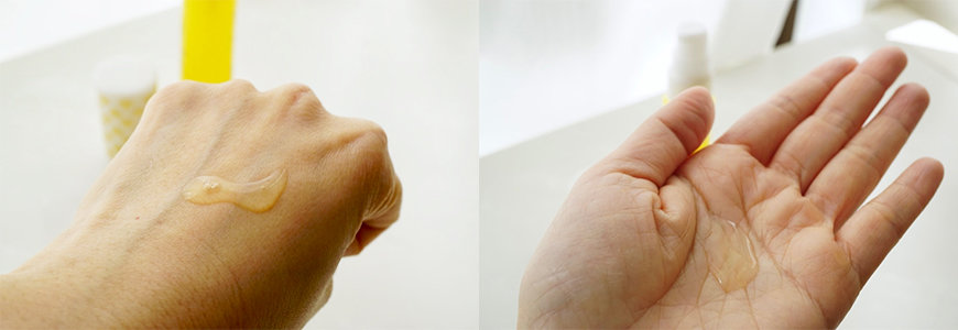 RJ女王肌美白精華按壓出來後是這樣的透明水狀液體,非常水感,類似滋潤型化妝水的濃稠度。擦起來不會黏黏的,覺得是夏天也會讓人樂意使用的精華液。
