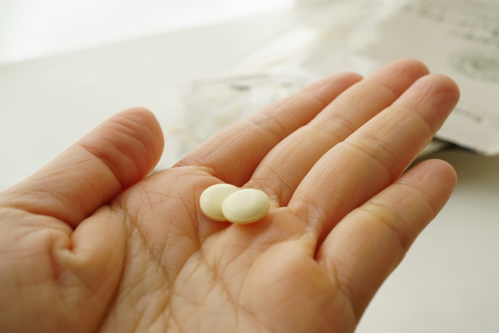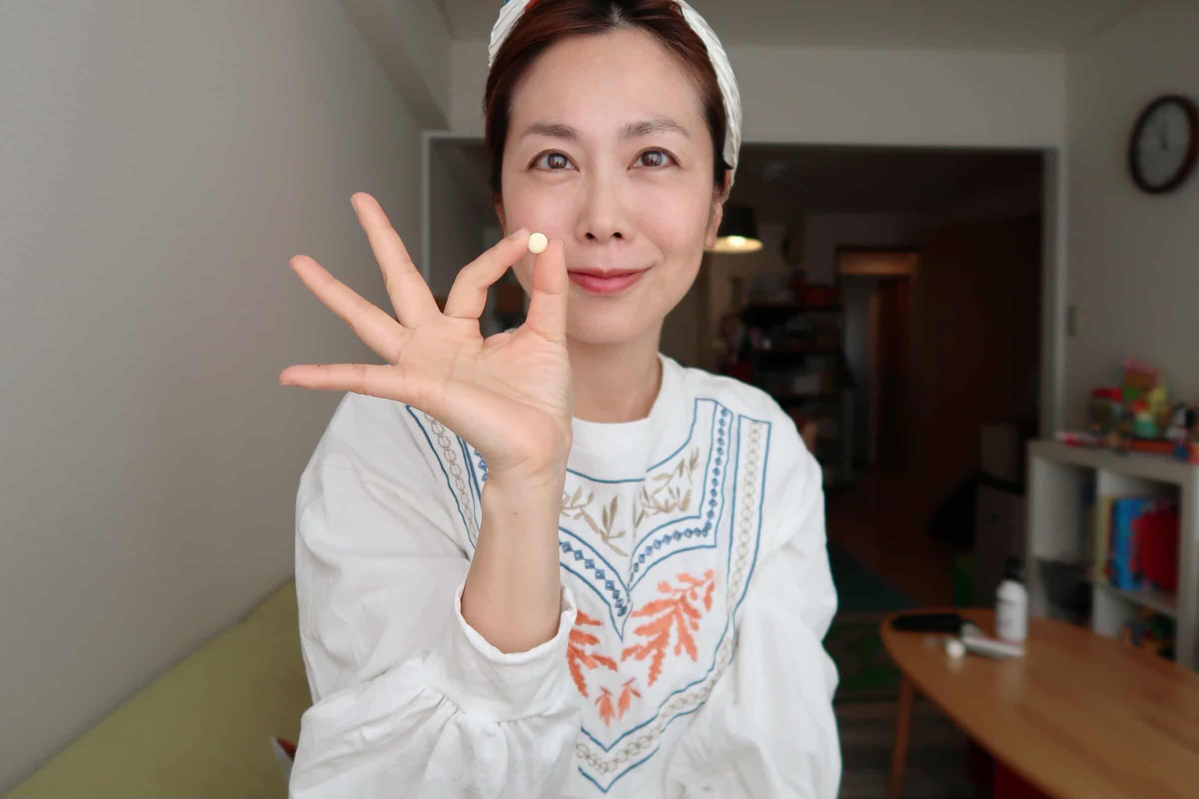 打開小包裝後,裡面就是這樣小小薄薄兩顆,直徑大約0.5cm的蜂王乳錠。我其實還蠻常被那種大顆綜合維他命給卡喉嚨的,但是山田養蜂場家的蜂王乳錠就真的迷你好食用啦!每錠以900mg生蜂王乳製成,1天1小包,輕鬆補充1800mg的蜂王乳。