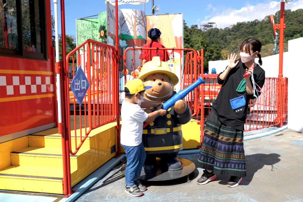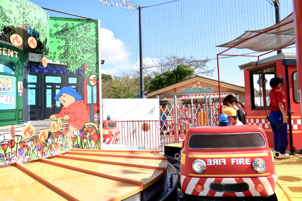 光是派丁頓園區(パディントン タウン)內就好好幾個遊樂設施,都是適合幼兒玩的設施。豆豆一開始就被派丁頓消防隊(しゅつどう!パディントン消防隊)給吸引,立刻衝過去!