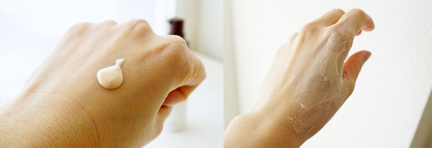 PERFECT ONE潤澤防曬隔離霜是這樣會流動的水乳液材質,真的就像塗保濕乳液一樣可以用手快速推開,不需要使用海綿。