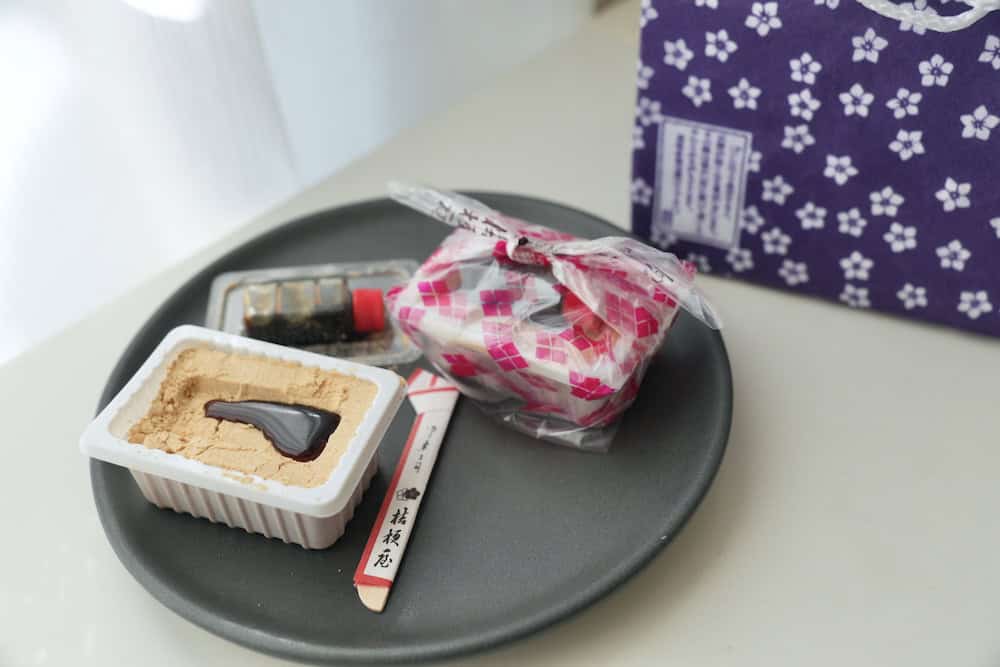 來到山梨就一定要吃當地甜點「信玄餅」!麻糬 x 黃豆粉 x 黑蜜漿 x 桔梗花樣包裝,古樸美味又可愛!