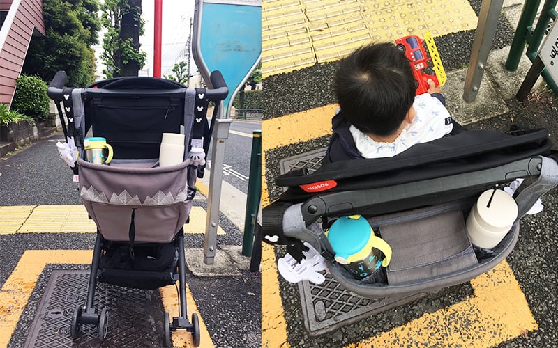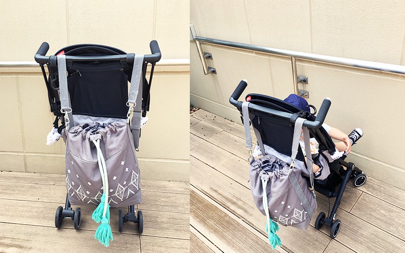 可以隨意變化用法的MARA MEA 3way包包只要再將背帶調整一下成H型,就可以這樣直接掛在嬰兒車上。這設計真的超貼心方便的,媽媽就不用一整天背著背包,掛在嬰兒車上省了很多力氣。加上包包的開口處是好開好拉的束口設計,所以掛在車上也非常方便取放物品。