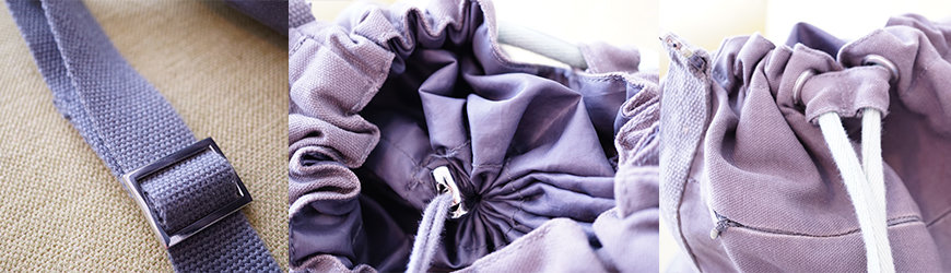 背帶可以自由調整長度。包包開口處有雙重束帶設計,圖(中)的束帶可以快速將包包束起,不怕東西掉出來。而藍色的流蘇束帶則是可以將包包的水桶型調整得自然好看。