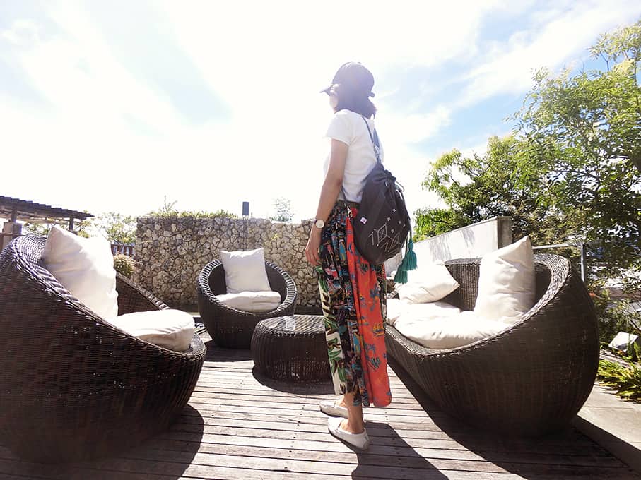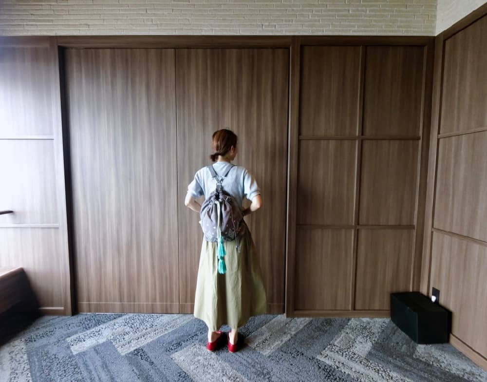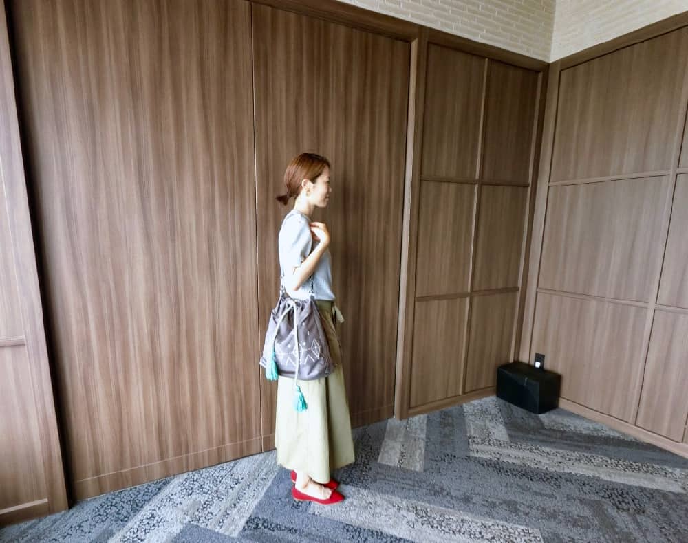 我時常都是騎自行車將豆豆送往保育園後去採訪,騎著自行車的時候我會後背,然後要採訪時就會快速改成這樣的側背。個人覺得側背時包包的形狀最好看,不管是搭配比較俐落的褲裝,或是優雅的裙裝都不會出錯。而且顏色還有材質真的是百搭,完全不用擔心與衣服的搭配這點讓人很安心又很省力。