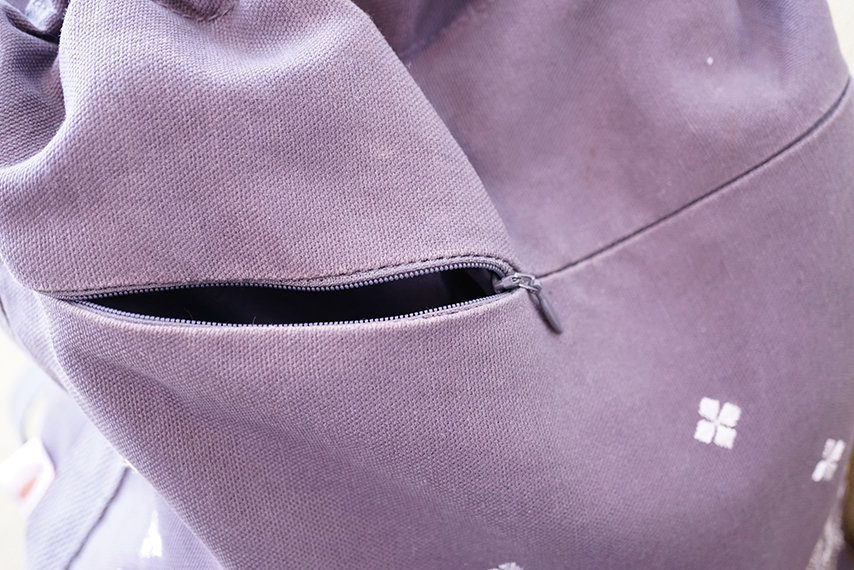 包包的最外側還有一個暗袋。一開始我覺得這個暗袋的拉鍊很細,不是那麼地好拉開關上。後來訊問過設計師後,才知道這個暗袋使用的是隱形拉鍊,主要的目的是就算包包背在身後,也不會很容易就被別人打開。可以放車票,鑰匙,手機等重要物品。(因為媽媽時常要慌張找東西,為了好開一點我還是有幫拉鍊上了潤滑油)