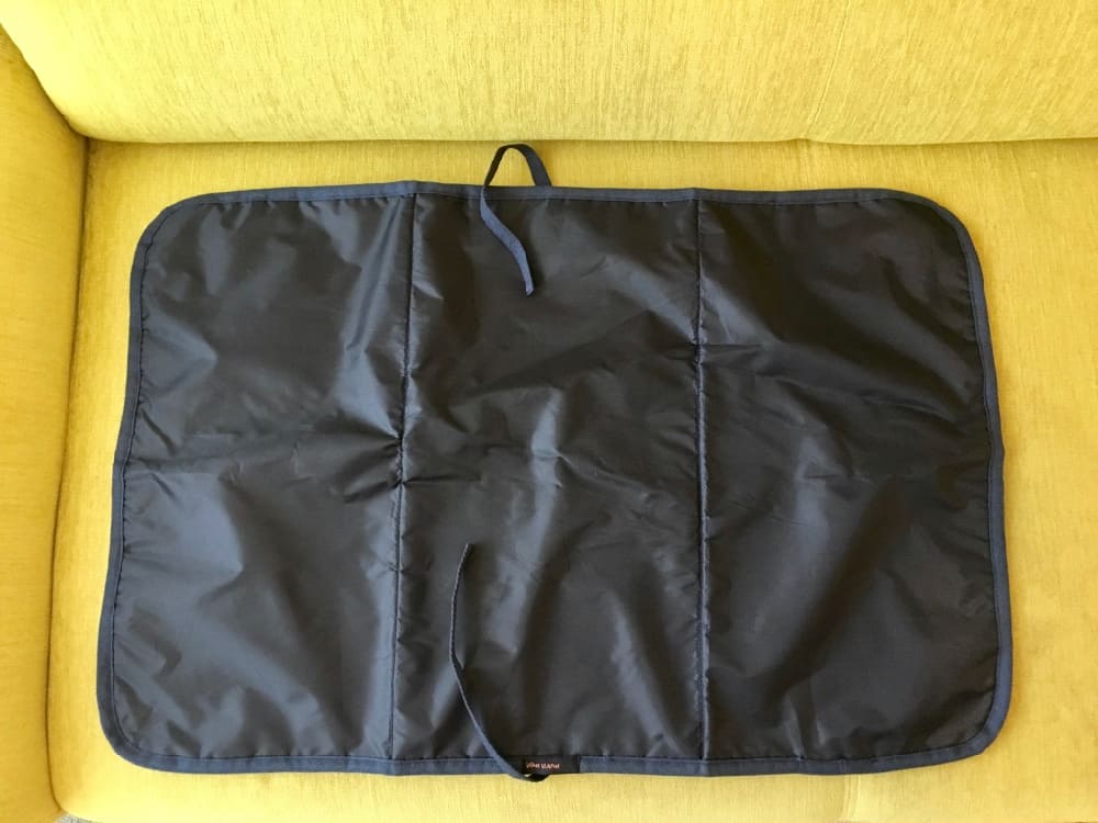 包內側的材質是防潑水100%聚酯纖維,不怕水杯或是奶瓶打翻不小心弄濕包包。內有1中型拉鍊夾層(可以放貴重物品)2個不同尺寸的鬆緊收口空間(適合放奶瓶水杯、食物罐或奶嘴)、2個開口夾層(可以放尿布或濕紙巾)。另外還附上一片深藍色的防水尿布墊,小枝豆已經用不到尿布墊,但我們參加戶外活動時,我還是會帶著當作草地上的坐墊使用,非常輕巧方便。