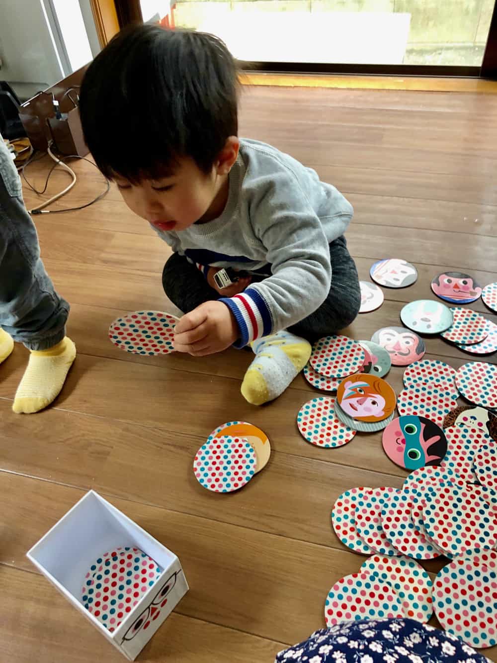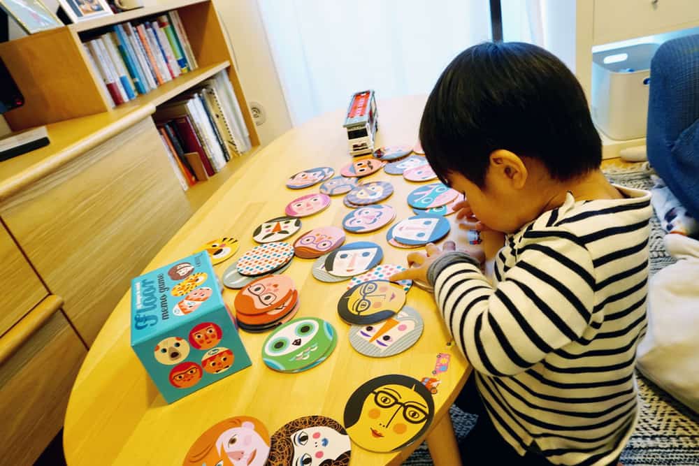 因為不想讓豆豆變成電視兒童,我會盡量陪他玩可以親子互動的遊戲。豆豆現在兩歲三個月,喜歡的玩的除了汽車遊戲(交給爸爸外),還喜歡玩拼圖跟扮家家酒。OMM Design的卡片遊戲來到我們家後,他也立刻很自然地就自己拿來玩。