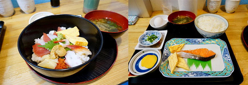 我們在朝市轉了轉後,在小巷子裡找到了非常超值的海鮮丼專賣店「しょう家」。海鮮丼套餐(附上漬菜以及紫蘇味增湯)只要日幣500円,價格非常庶民。我點了海鮮丼,枝豆則是和豆豆一起吃了烤魚套餐。