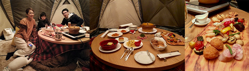 打開帳篷,我們準備要晚餐囉!這時候仙台正在下雪,氣溫大約只有兩度。還好帳篷裡面有暖桌還有暖氣(而且居然還有水晶燈,也太時髦XD),所以整個帳篷裡面暖呼呼的。