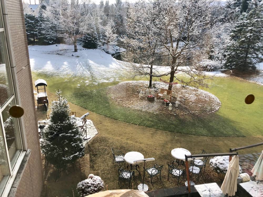 窗外的景色太美太美了!我忍不住打開陽台窗戶走到外面來拍照,樹和草皮彷彿都像灑滿了糖霜一樣,美不勝收。