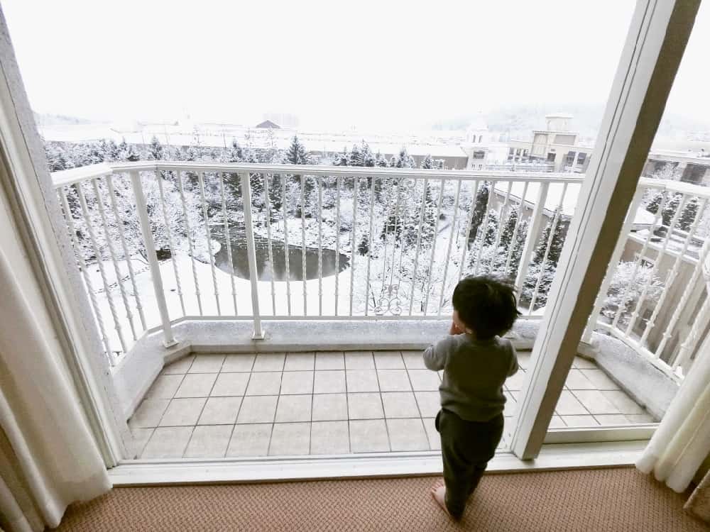 仙台皇家公園酒店給我們的驚喜還不只有這些而已,我們在飯店睡了一覺後,醒來發現窗外已經是一片白皚皚的景像,昨天晚上才看著點燈一邊泡澡一邊放鬆身心的哩!豆豆站在窗邊張大嘴巴一直「哇!!哇!!!好漂亮!好漂亮!」地說個不停。雖然帶著小小孩出門有許多不便之處,但是看到他們被景色感動,受到新事物的刺激的驚奇樣,就覺得那一點疲累根本都不算什麼了。