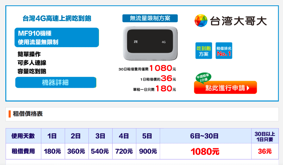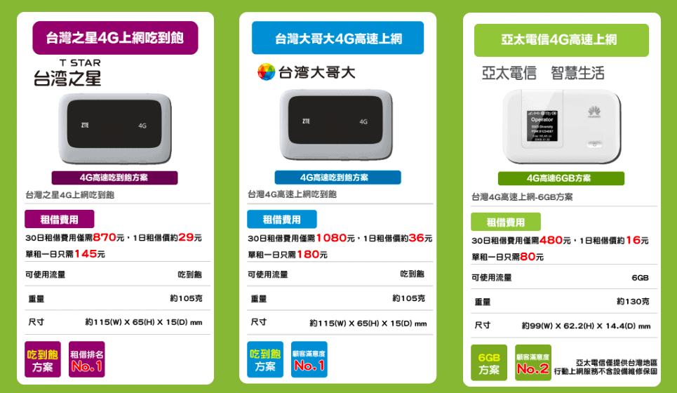 台灣租借WiFi有推出各種不同方案讓大家依照自己的使用需求做選擇,就算只租借一天也沒問題。我因為考慮到希望訊號穩定加上要網路吃到飽,所以選擇台灣大哥大的4G高速上網吃到飽方案。(以上是他們目前最有人氣的3種方案)
