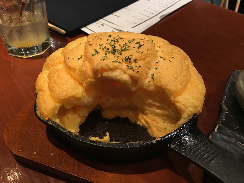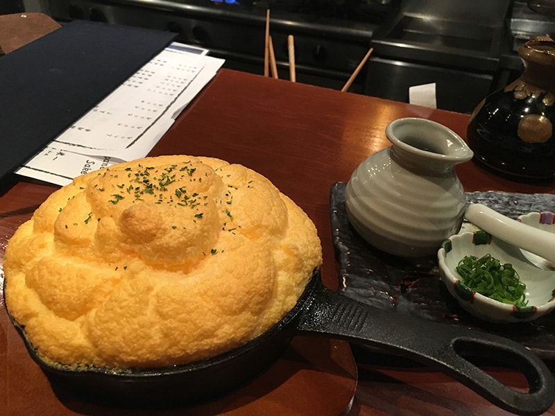 再來我想說說的就是這個超厲害的「舒芙蕾玉子燒」,一開始真的是被菜單上面的名字給吸引,想說到底是什麼樣的玉子燒呢?點餐之後左等右等,先等師傅用電動打蛋機將蛋液打得極度細緻,之後再放進去烤箱,最後變成一個外型很像波蘿麵包的料理。看來要作出這個玉子燒真的是要很多道費工手續,我們等到最雞湯鍋還有炭燒雞肉串都上了最後才等到這道玉子燒。