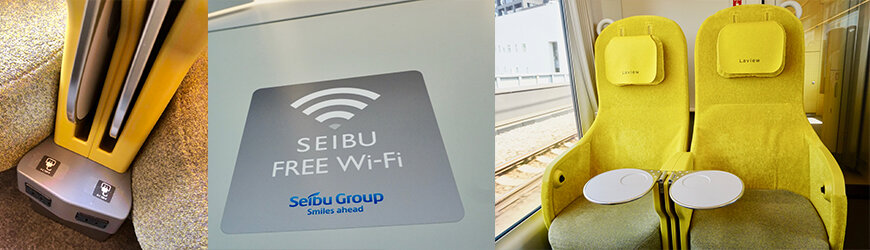 出發前先研究了一下這台Laview特急電車,它很法式的名字其實別有涵意。其實Laview結合了Luxury Living(奢華空間) x arrow (快速) x view(景色)等概念,想要讓乘客在舒適放鬆的空間裡,透過寬敞的觀景窗盡情享受美麗的東京近郊美景。這觀景窗真的是我目前搭過的電車中視野最寬敞的,居然每面窗有158 cm x 135cm大。另外我也非常欣賞車內空間的芥末黃色,非常呼應旅行中的愉快心情!
