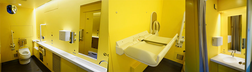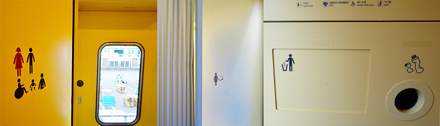 和其他電車很不一樣的是,Laview電車裡的廁所空間超寬敞的,連嬰兒車都可以直接推進去(有多用途洗手間和女性專用洗手間),多用途洗手間內還設有尿布台非常貼心。除了洗手間外還有附拉簾的個人補妝間,整體空間都是可愛明亮的黃色,果然是針對女生推出設計我的心瞬間被偷走了XD