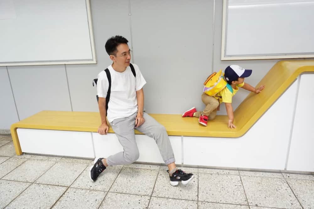 來到座位後先檢視一下基本配備。充電座OK! 免費Wi-Fi OK! 座位可以簡單旋轉!每個座位都有內建可愛圓形小桌面,豆豆說超興奮的說「這個桌子和飛機上的桌子好像耶!」